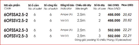 Thông số của Ổ Cắm Kéo Dài Công Suất Lớn LiOA 6OFSSA2.5-2 (6OFSSV2.5-2)