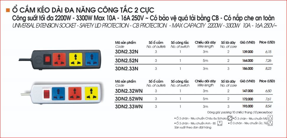 Thông số của Ổ Cắm Kéo Dài Đa Năng Công Tắc 2 Cực LiOA 3DN2.52WN