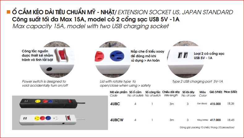 Thông số của Ổ Cắm Kéo Dài LiOA Tiêu Chuẩn Mỹ Nhật 4UBC
