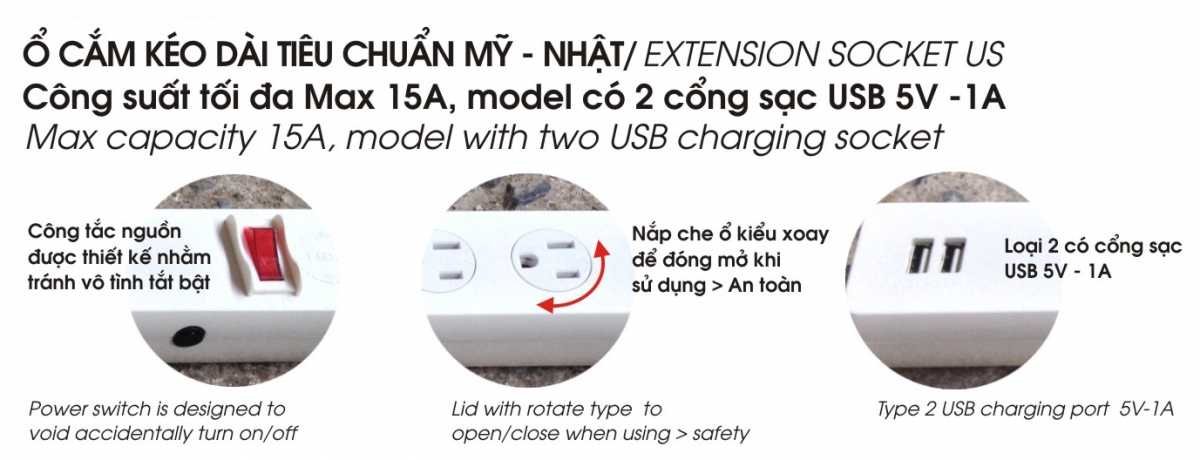 Ổ Cắm Kéo Dài LiOA Tiêu Chuẩn Mỹ Nhật 6UBCW có công tắc nguồn được thiết kế nhằm trán vô tình tắt bật, có nắp che kiểu xoay để đóng-mở khi sử dụng. Ổ Cắm Kéo Dài LiOA Tiêu Chuẩn Mỹ Nhật này còn có 2 ổ sạc usb 5V-1A